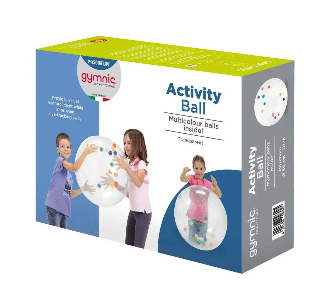 The Activity Ball is a clear, 50cm ball with small colored balls inside that move freely when the ball is rolled or bounced. Very recommended for the use in therapy to promote three dimensional sight and co-ordination.