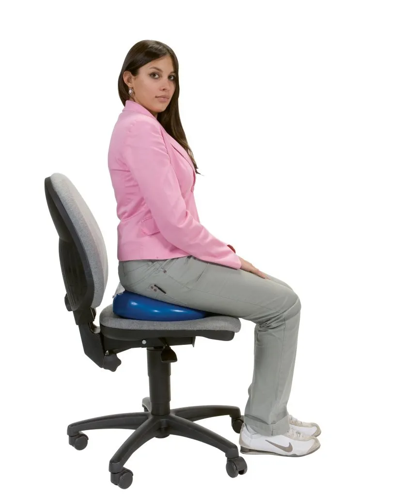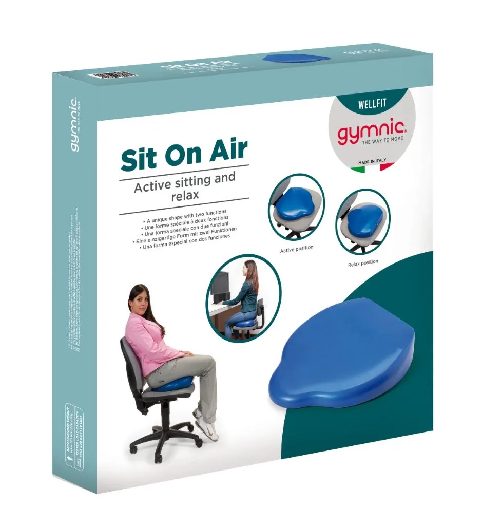 The Sit On Air is a dynamic inflatable cushion which, thanks to its shape, has a double use. With its bump towards the external part of the chair, it stimulates the torso muscles which sustain the spinal column, promoting the maintenance of a correct posture. With its bump towards the internal part of the chair, it allows to lift the legs into a relaxing position. The movement and the provided beneficial effects are comparable to the benefits which are offered by the ball. A brochure with some exercises is included in the packaging.